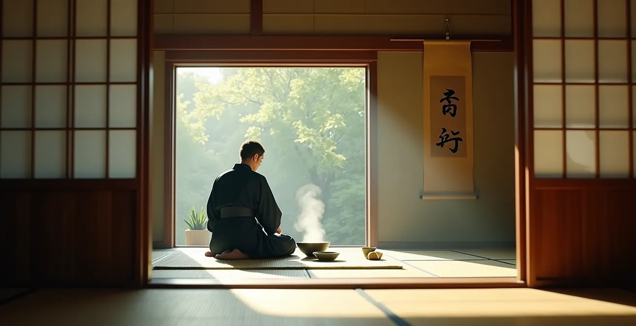 L’erreur la plus commune est de voir la cérémonie comme une performance de l’hôte (le teishu) que l’invité se contente d’observer. En réalité, il s’agit d’un dialogue silencieux, où chaque action de l’hôte est une invitation à la sérénité. Comme le montre une analyse des principes fondamentaux du maître de thé Sen no Rikyū, la cérémonie repose sur l’harmonie (Wa), le respect (Kei), la pureté (Sei) et la tranquillité (Jaku). Ces principes ne sont pas des abstractions ; ils sont rendus tangibles par des gestes qui sont autant d’actes de soin de l’esprit.